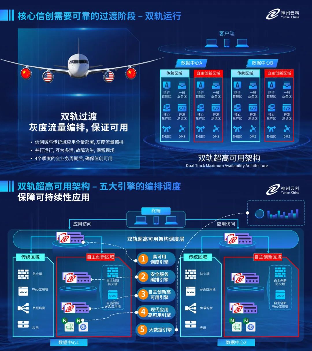 为助力金融业务高质量发展,更好地应对数字经济时代对可持续性的高要求,实现“信创”与“数字化”齐头并进,神州云科创新性的推出了核心信创·双轨过渡的超高可用架构。该架构在双活数据中心的分区调度基础上,增加信创域和非信创域的分域调度,实行信创域与传统域应用全量部署,使双中心运营变为双中心四区域并行运行,互为多活,将“0到1”的单轨建设道路变为分区分域协同的多活双轨超高可用架构。帮助客户在新架构下,保障“信创”的同时解决性能瓶颈,提升稳定性,保证应用可持续性,最终实现信创区域和非信创区域的平滑过渡,完成国产化替代目标。