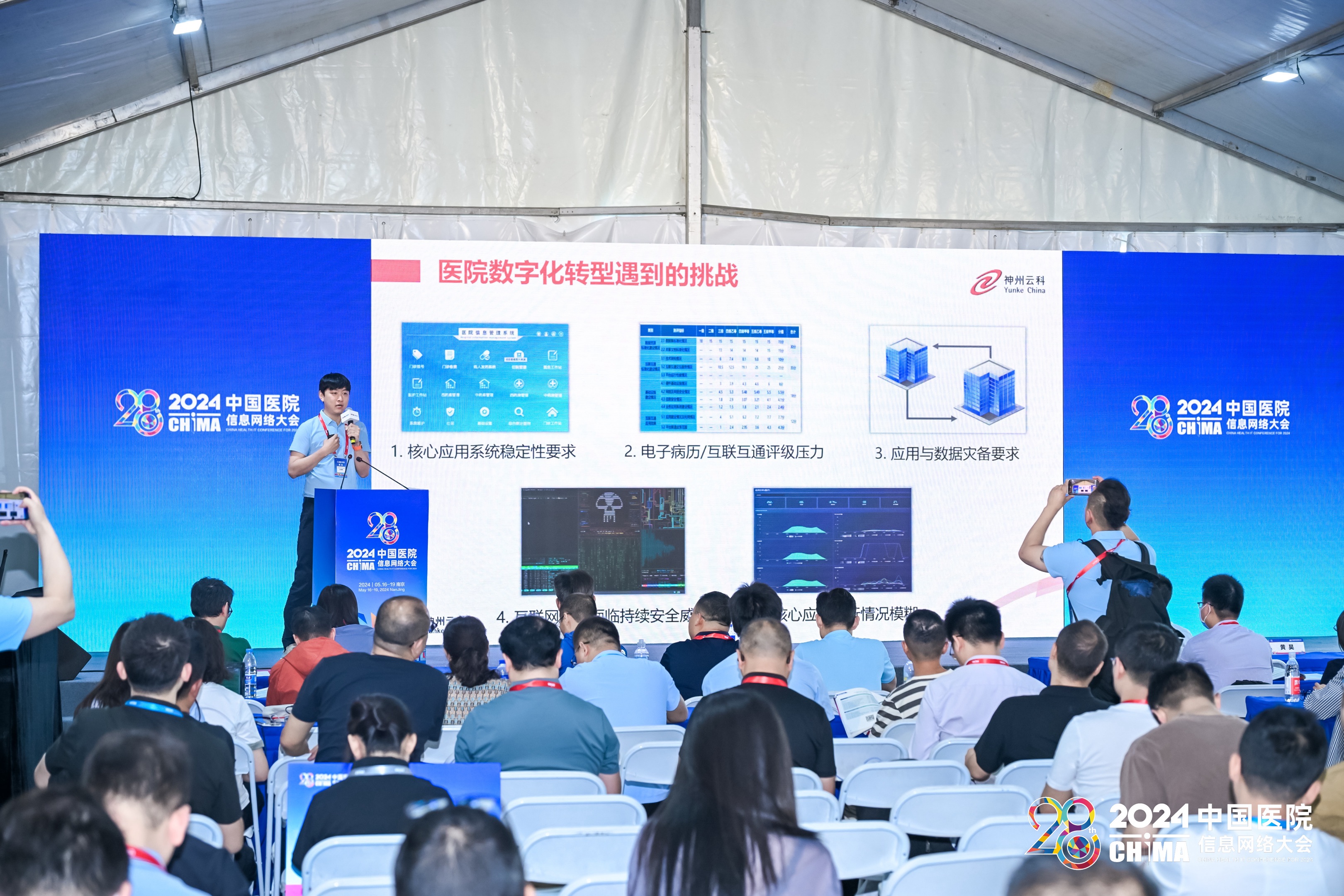 2024年5月17-19日,第28届中国医院网络信息大会(CHIMA2024)在南京圆满落幕。本次大会以新质生产力理论为指导,以深化应用,融合创新,用信息技术赋能医院高质量发展为主题,邀请国家卫生健康委相关司局领导、两院院士、国内外医疗卫生信息化领域知名专家学者、领军人物做主旨报告。在这场医疗信息化的年度盛会上,神州云科会上携其“保障医院核心系统健康无虞”主题演讲精彩亮相,成为展会的一大亮点。